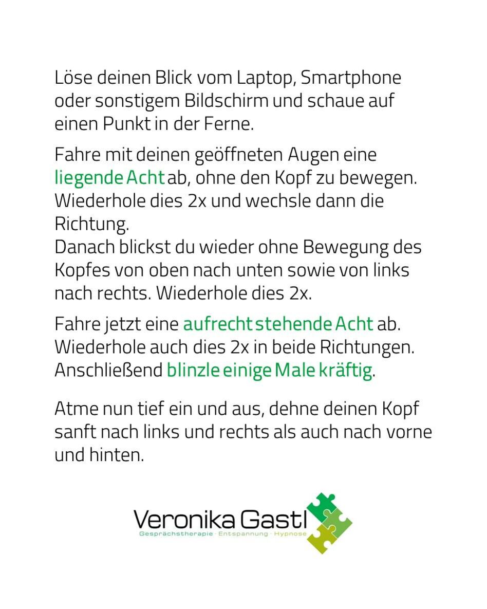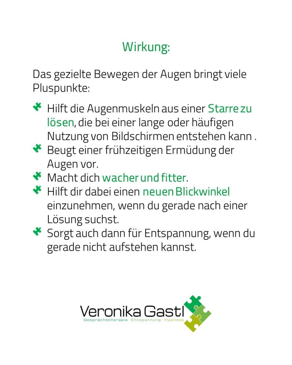 Deine Augen bewusst zu bewegen entspannt selbstverständlich die Augenmuskulatur, löst aber auch deine Gedanken aus einer Starre.