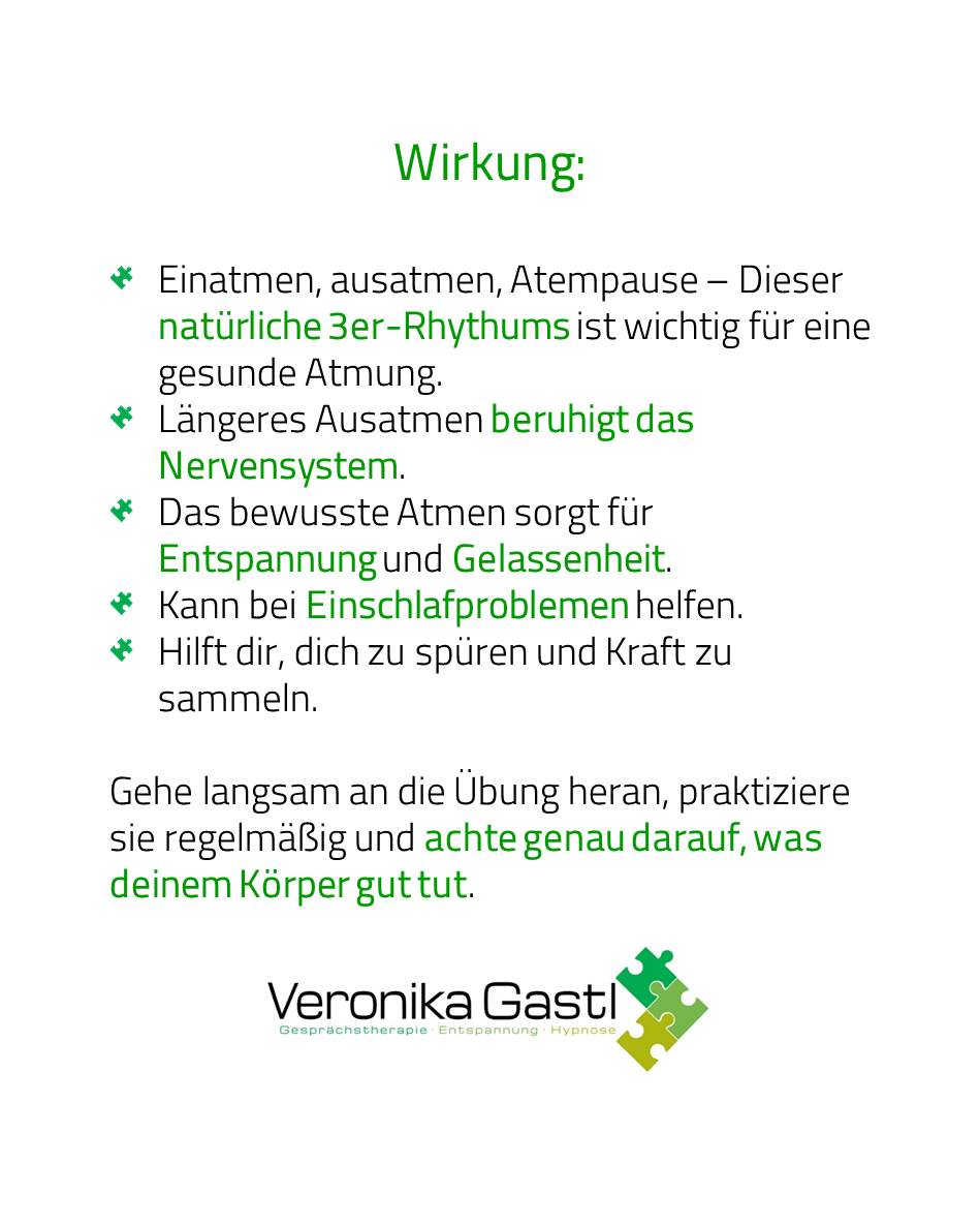 Gerade das längere Ausatmen unterstützt die Entspannung und gibt uns Ruhe.