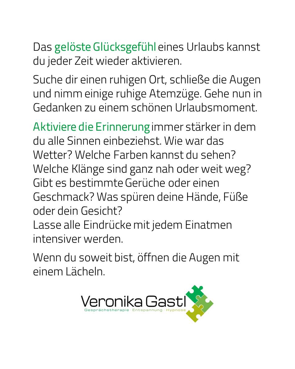 Aktiviere mit dieser Mikroübung deine Glücksgefühle vom letzten Urlaub und nimm diese entspannte Energie mit in den Arbeitstag.